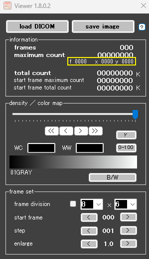 マウスカーソルの位置のフレーム番号と座標と画素値の表示