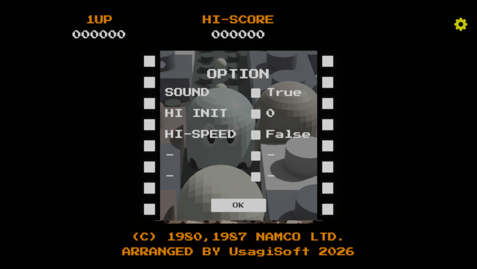 オプションでサウンドのありなし、ハイスコア初期化、ハイスピードモードの設定ができます